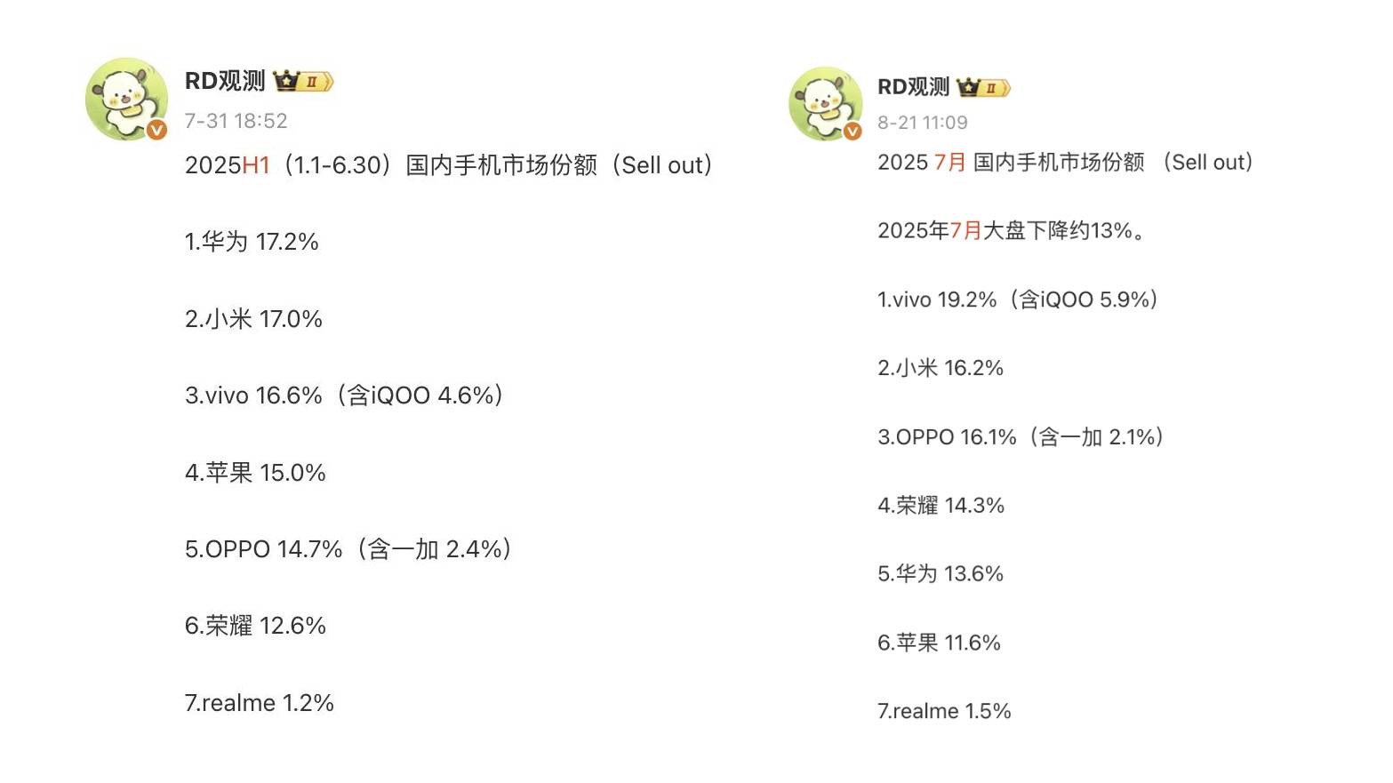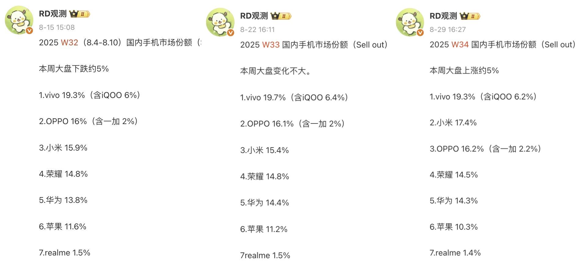 对于2025年W1-W34国内手机排行榜,亓纪的想法是这样的:如果你关注周榜和月榜的话,这样的排名基本上都在意料之中,比较意外的是苹果手机,在最困难的时刻依旧能够稳定在国内第五名。相比个人点评,亓纪更信任榜单数据,因为人是主观且利益相关的。而数据是相对严谨的,并且大部分数据是可以相互验证的,想要造假的成本还是挺高的,并且很容易被行内人识破。