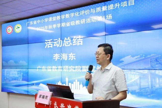 广东省教育研究院副院长李海东对活动进行总结,认为本次活动聚焦“数字教研导师”实践智慧与成长,兼具理论高度与现实温度。他强调,国家相关政策为教育数字化发展提供机遇,期望各项目校在人工智能赋能教研、课堂教学评价及教师发展等领域展现特色、保持领先,形成“百花齐放、百家争鸣”的实践成果;后续省教研院将持续开展系列省级教研活动,鼓励参与教师抓住机遇,深化实践;同时要求各地各校坚守教育本质,以数字化教研为支撑,助力广东教育高质量发展。