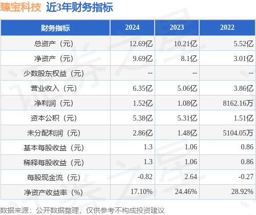 从目前公布的财报来看,臻宝科技2024年总资产为12.69亿元,净资产为9.69亿元;近3年净利润分别为1.52亿元(2024年),1.08亿元(2023年),8162.16万元(2022年)。详情见下表: