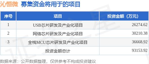 证券之星消息,南京沁恒微电子股份有限公司(简称:沁恒微)拟在上交所科创板上市,募资总金额为9.32亿元,保荐机构为华泰联合证券有限责任公司。募集资金拟用于USB芯片研发及产业化项目、网络芯片研发及产业化项目、全栈MCU芯片研发及产业化项目,详见下表: