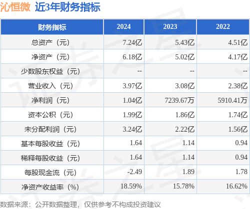 从目前公布的财报来看,沁恒微2024年总资产为7.24亿元,净资产为6.18亿元;近3年净利润分别为1.04亿元(2024年),7239.67万元(2023年),5910.41万元(2022年)。详情见下表: